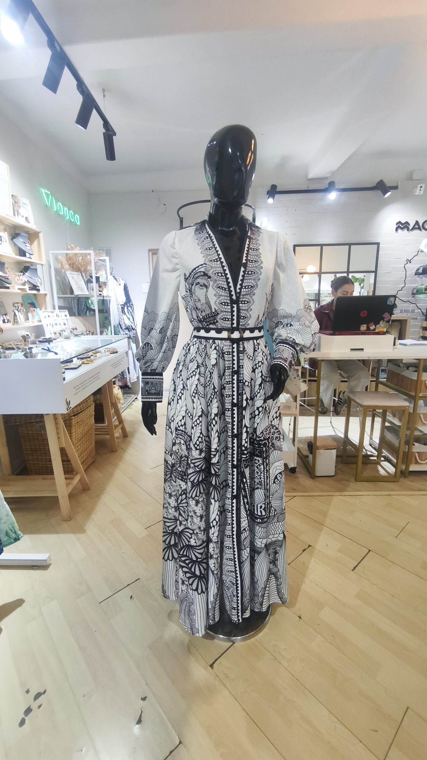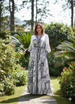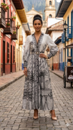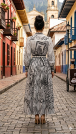 Descubre una pieza que fusiona arte e historia: este vestido rinde un sofisticado homenaje a la inigualable biodiversidad de Colombia a través de un diseño inspirado en los antiguos sellos postales de nuestro país. Su estampado artístico en blanco y negro recrea la esencia de las emblemáticas estampillas de colección, entrelazando elementos de nuestra flora y fauna en una silueta elegante y atemporal. Más que una prenda, es un lienzo que captura el legado de nuestra correspondencia nacional, diseñado para quienes desean llevar la identidad y la riqueza natural de Colombia con distinción y estilo.»